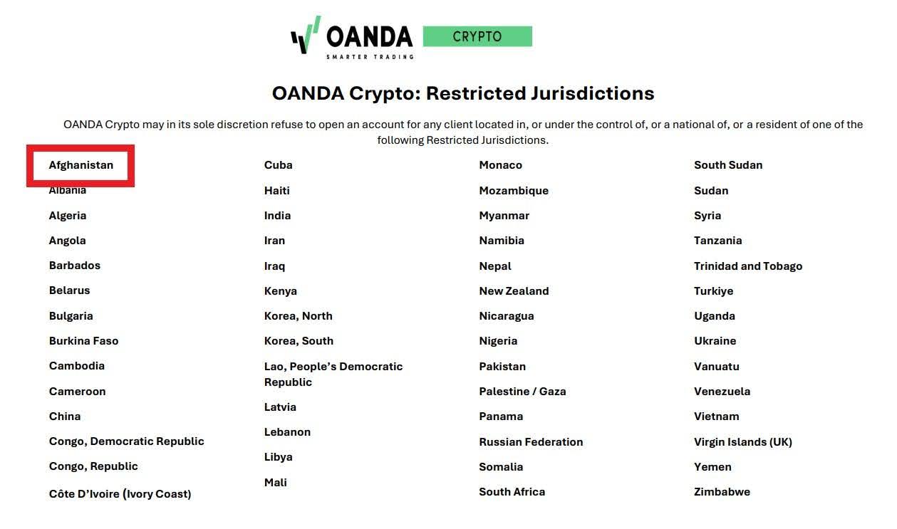 نام افغانستان نیز در این لیست دیده میشود. بنابراین معاملهگران کشور افغانستان مجاز به استفاده از خدمات این کارگزاری نبوده و باید به فکر جایگزین برای بروکر Oanda باشند.