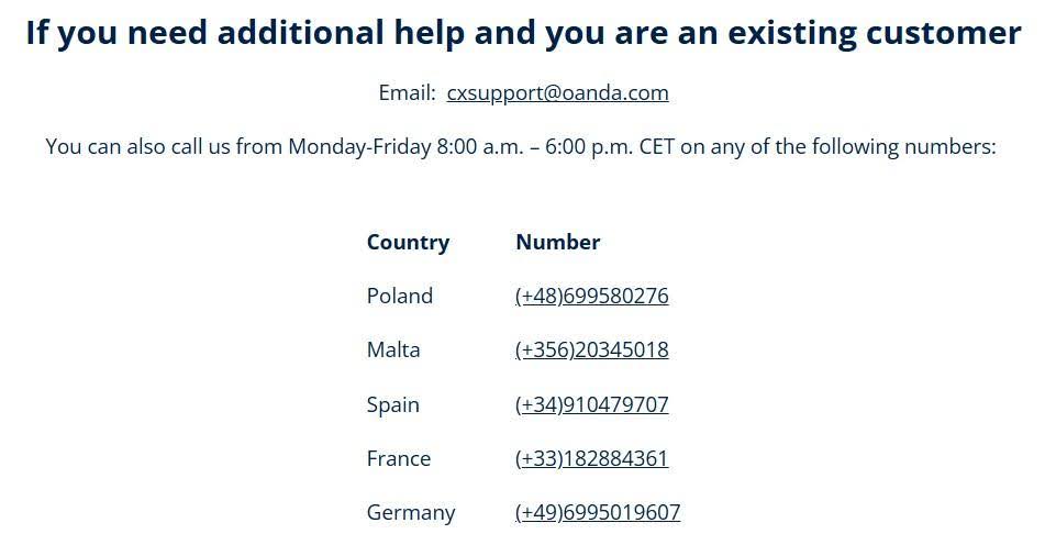 بروکر Oanda خدمات پشتیبانی خود را در قالب ایمیل و تلفن به کاربران ارائه میدهد. در تصویر زیر میتوانید نشانی ایمیل بروکر اوآندا و همچنین شماره تماس دفاتر این کارگزاری در کشورهای مختلف را مشاهده کنید. پشتیبانی Oanda بهصورت تمام وقت فعالیت نمیکند و در روزهای دوشنبه تا جمعه (10 ساعت در هر روز کاری) پاسخگوی کاربران است.
