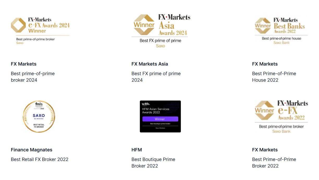 Saxo bank علاوه بر برخورداری از رگولههای معتبر، جوایز متعددی نیز در رویدادهای بینالمللی در طی سالهای اخیر دریافت کرده است. انتخاب ساکسو بانک بهعنوان بهترین کارگزاری فارکس در رویدادهای جهانی نشاندهنده اعتبار بالای این بروکر است. در تصویر زیر، تعدادی از جوایز دریافتی ساکسو بانک را مشاهده میکنید.