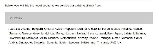 در تصویر زیر، فهرست کشورهایی که بروکر ساکسو بانک به آنها خدمات ارائه میدهد را مشاهده میکنید. در این فهرست نامی از کشور افغانستان به میان نیامده است.