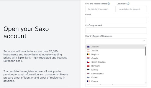 در صفحه ثبت نام بروکر Saxo bank برای افتتاح حساب کاربری باید تابعیت خود را مشاهده کنید. در این بخش نیز امکان انتخاب تابعیت افغانستانی وجود ندارد.