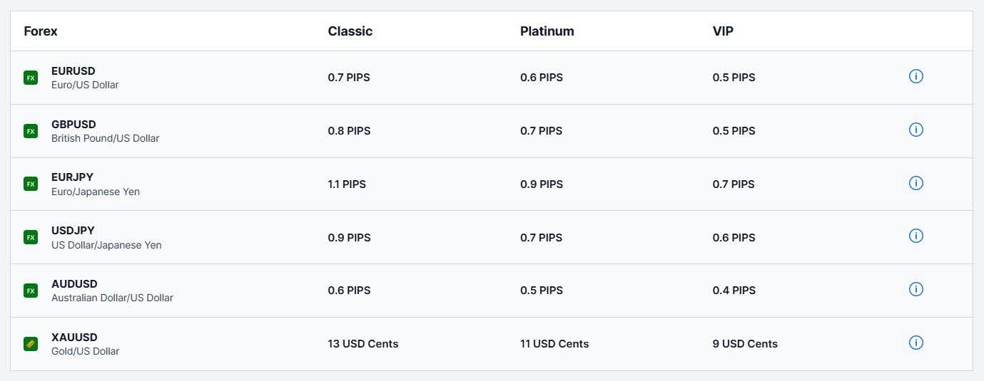 در بروکر ساکسو بانک، نرخ اسپرد نمادهای معاملاتی فارکس براساس نوع حساب معاملاتی مشخص میشود. در تصویر زیر، نرخ اسپرد هر یک از حسابهای کلاسیک، پلاتینیوم و وی آی پی را برای جفت ارزهای معاملاتی اصلی فارکس و طلا مشاهده میکنید: