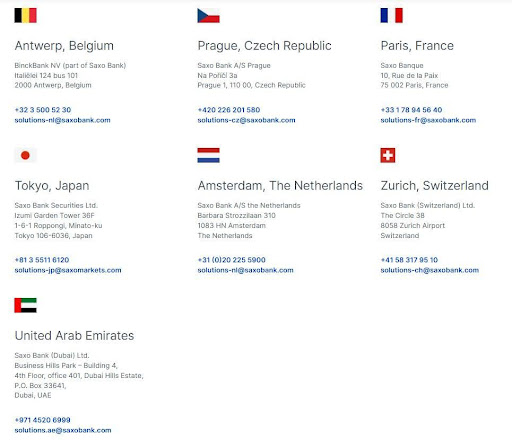 در هر یک از پلتفرمهای معاملاتی ساکسو بانک امکان ارتباط و گفتگوی آنلاین با پشتیبانی این کارگزاری فراهم شده است. همچنین در تصویر زیر میتوانید نشانی ایمیل، شماره تماس و آدرس هر یک شعب ساکسو بانک در کشورهای مختلف را مشاهده کنید.