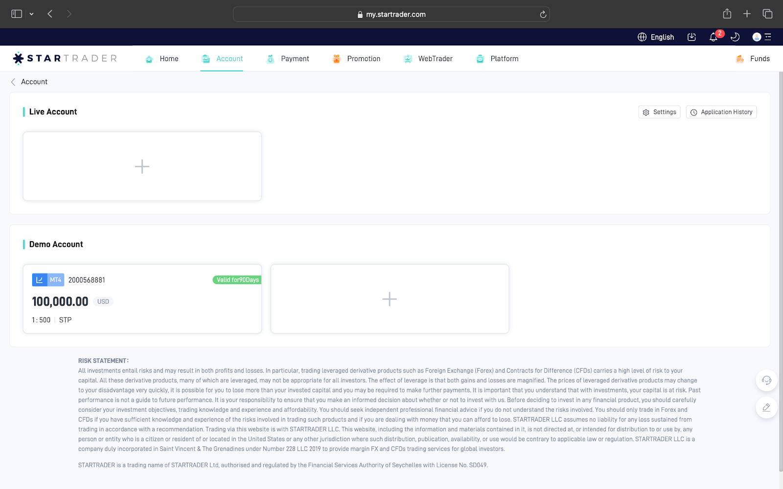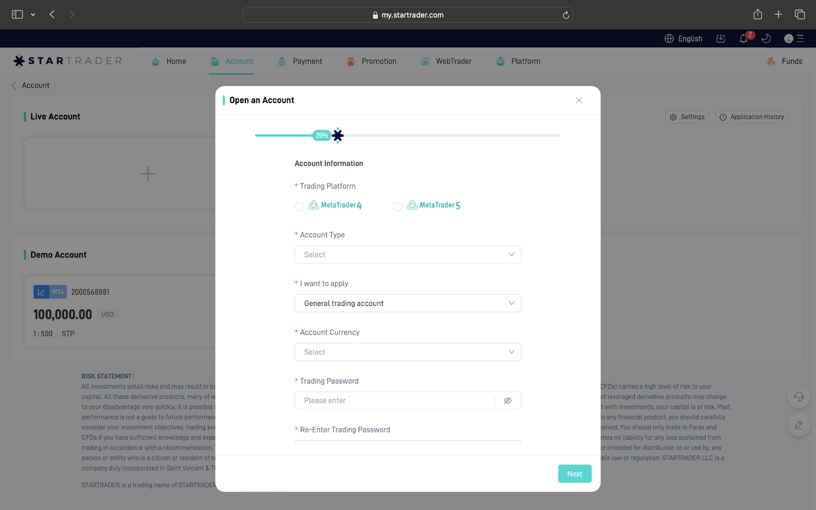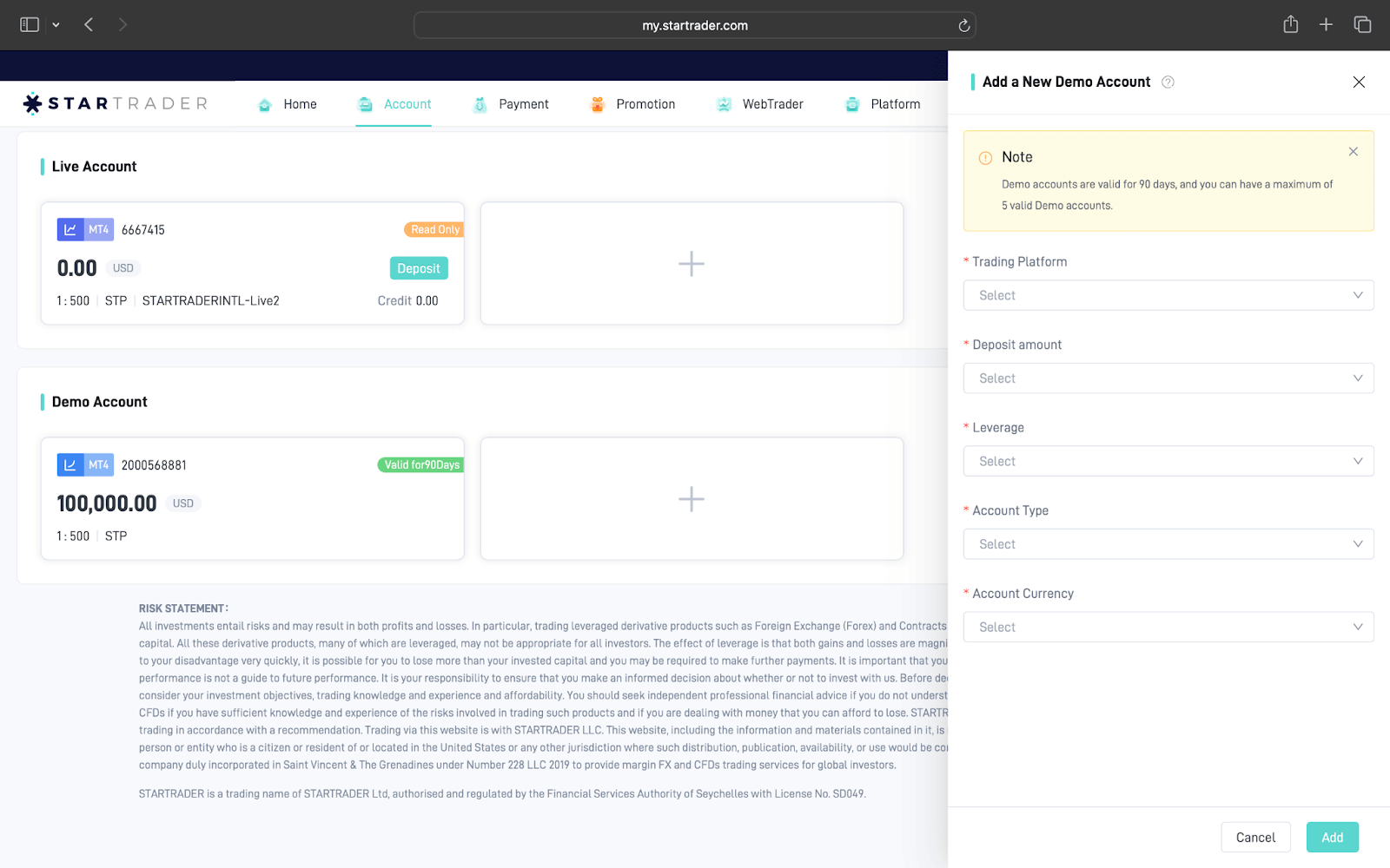 بروکر استار تریدر امکان معامله آزمایشی در حساب دمو را هم فراهم کرده است. بدین منظور، روی نوار ابزار بالا، گزینه Account را انتخاب کنید. حال در بخش Demo Account، روی بعلاوه کلیک کنید. در ادامه، صفحهای مشابه تصویر زیر باز میشود. اطلاعات حساب دمو مد نظر را وارد کنید تا حساب کاربری ایجاد شود.