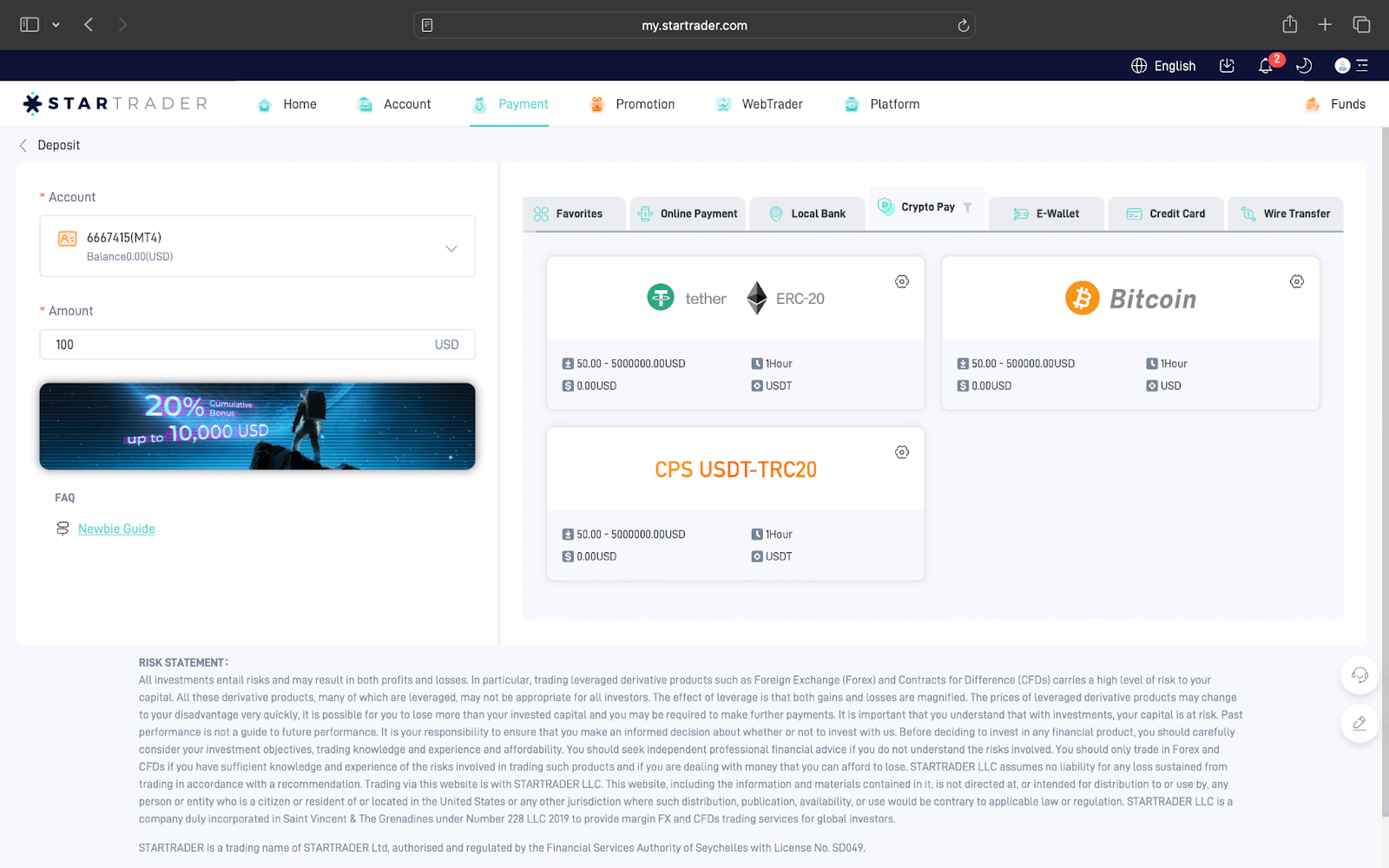 برای واریز و برداشت در بروکر استار تریدر از نوار ابزار بالا، گزینه Payment را انتخاب کنید. حال در صفحه باز شده، گزینههای Deposit برای واریز و Withdraw برای برداشت نمایش داده میشود. ابتدا گزینه Deposit را انتخاب کنید.