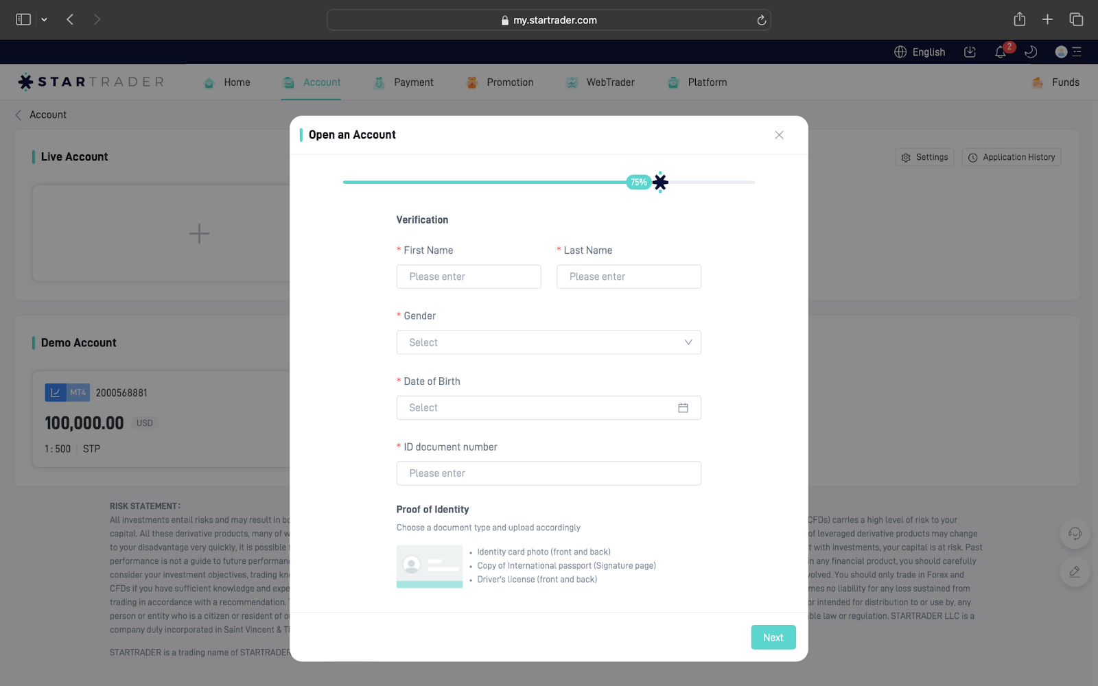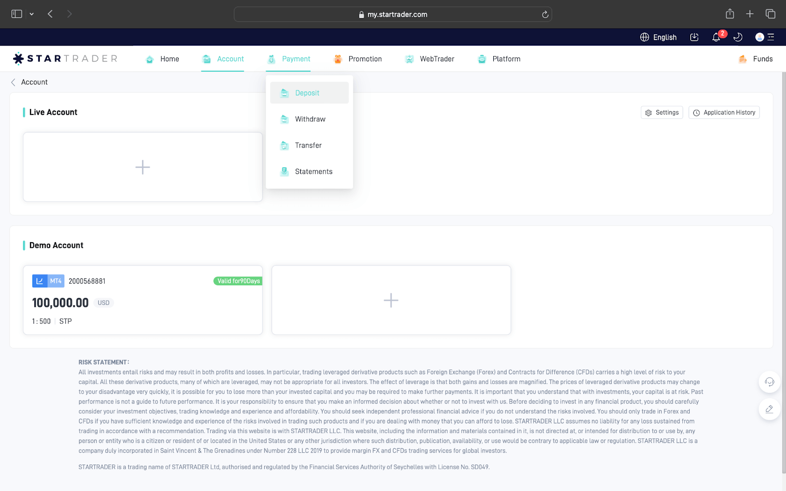 برای اینکه بتوانید احراز هویت خود را در بروکر استار تریدر تکمیل کنید، نیاز است از بخش نوار ابزار بالا، گزینه Account را انتخاب کنید. حال تصویر زیر برای شما باز میشود. در این بخش، روی گزینه Live Account کلیک کنید.