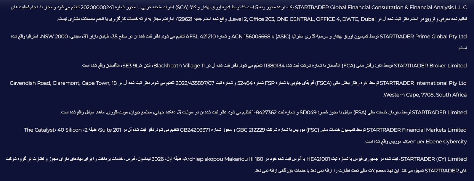دفتر مرکزی StarTrader در سیشل قرار دارد و این کارگزاری دارای 6 شعبه دیگر در کشورهای انگلیس، استرالیا، امارات و … است.