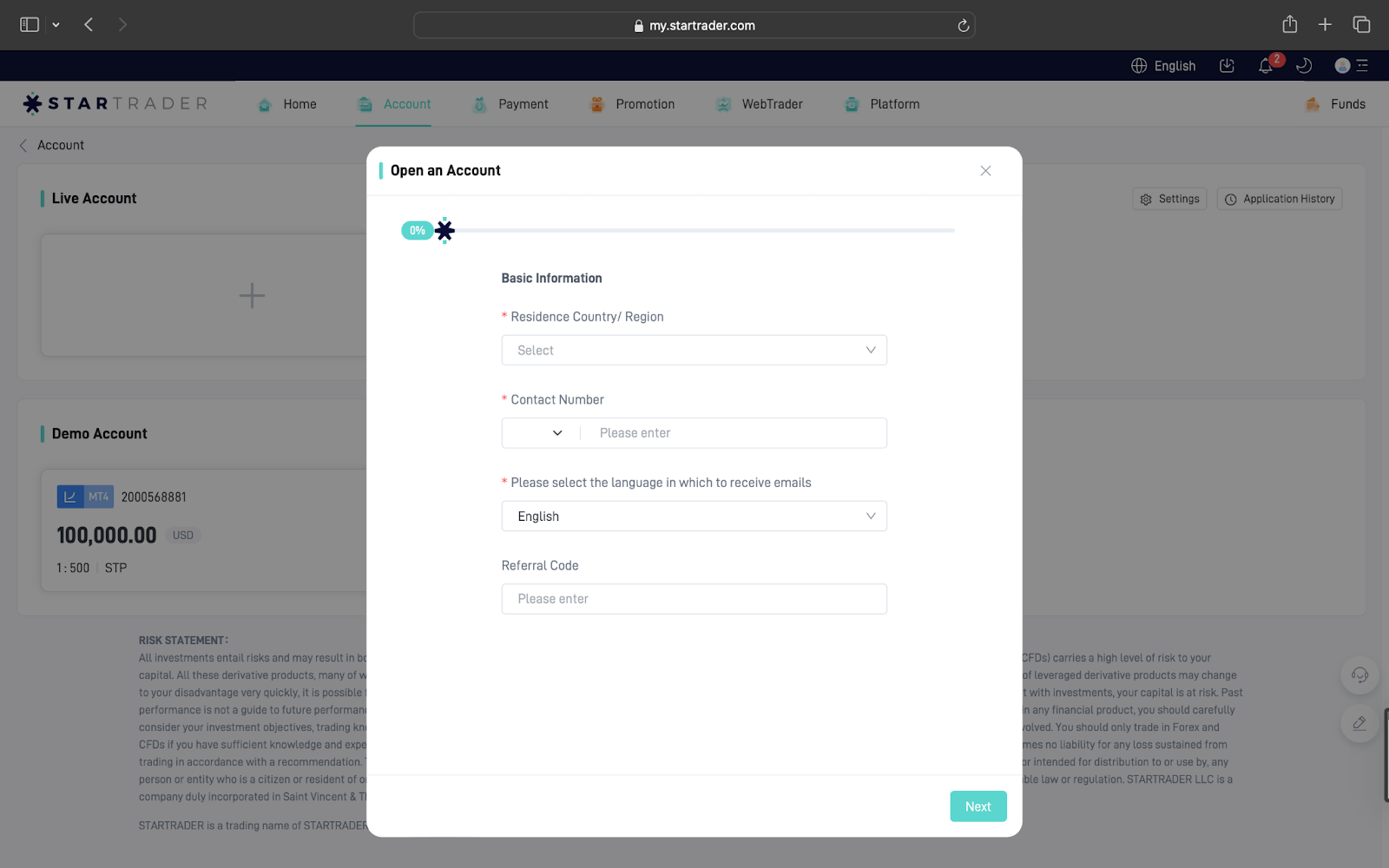 برای ثبت نام در بروکر استار تریدر، از طریق سایت startrader.com وارد صفحه اصلی آن شوید. سپس روی گزینه Open Live Account کلیک کنید. پس از آن، وارد صفحهی زیر میشوید که ابتدا باید کشور افغانستان را انتخاب کنید.